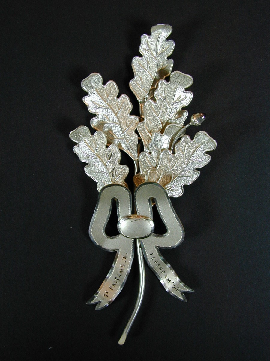 Fanfareconcours, 1e prijs Ilpendam: zilveren eiketak om aan vaandel te bevestigen