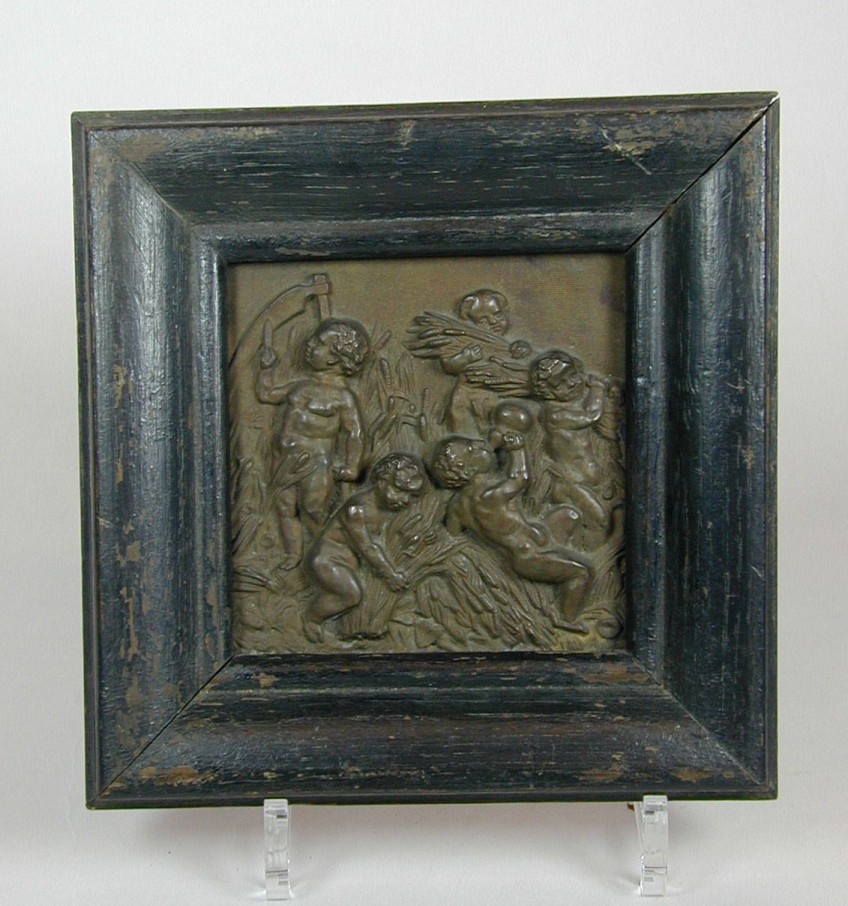 Reliëf in lijst, naakte kinderen die graan oogsten en wijn drinken, verwijzing eucharistie(?)