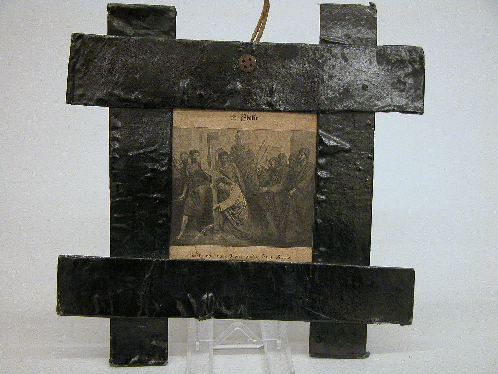 Kruiswegstatie in lijst van zwart kleefband: derde statie, eerste val van Christus onder kruis