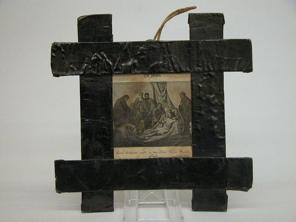 Kruiswegstatie in lijst van zwart kleefband: dertiende statie, Christus ligt in schoot Maria
