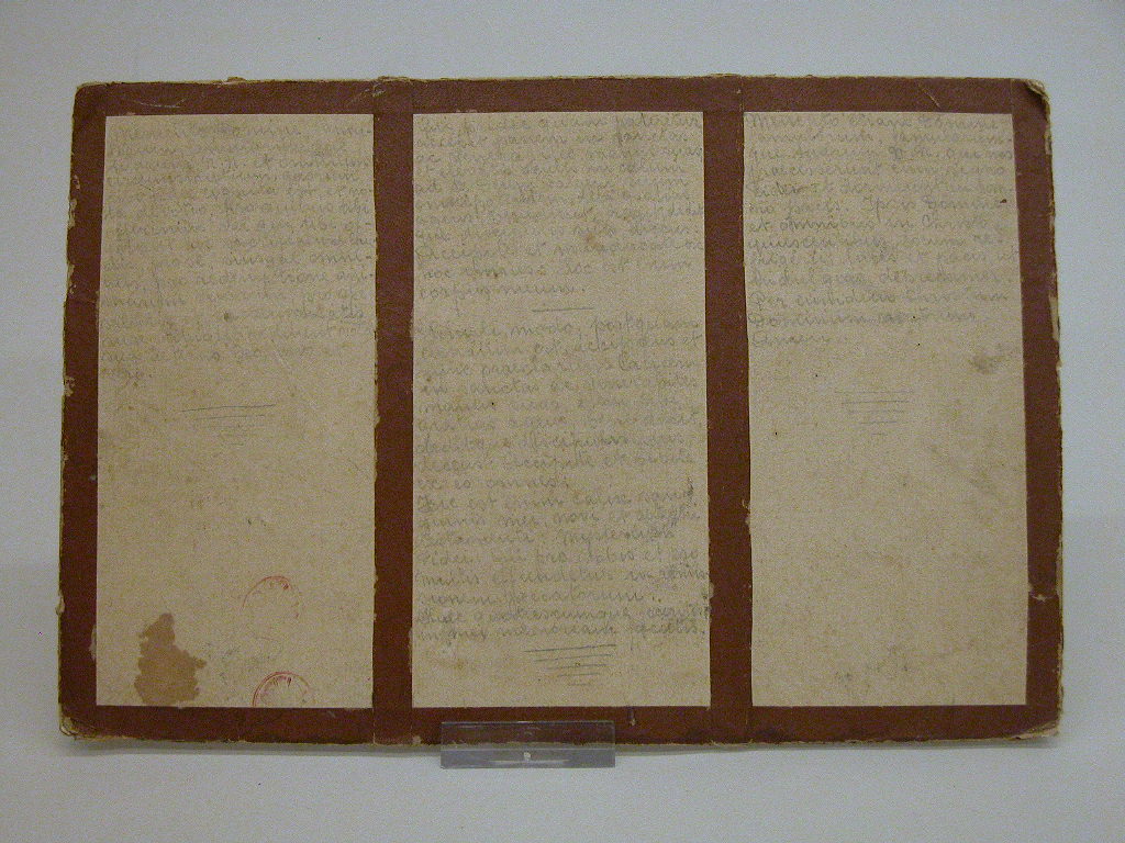 Speelgoedcanonbord met potlood geschreven, ingelijst met bruin kleefband