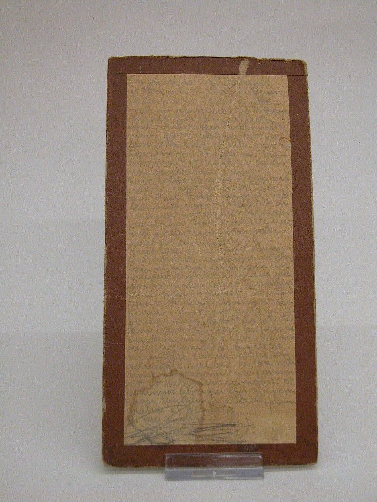Speelgoedcanonbord met potlood geschreven, ingelijst met bruin kleefband