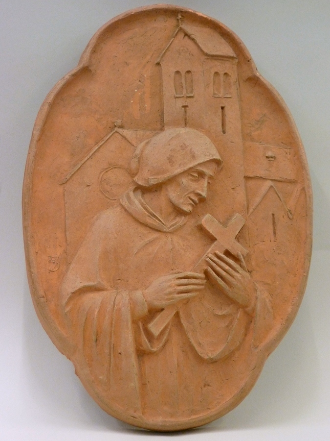 Wandreliëf met vrouwelijke heilige(?) met kruis, kerk als achtergrond