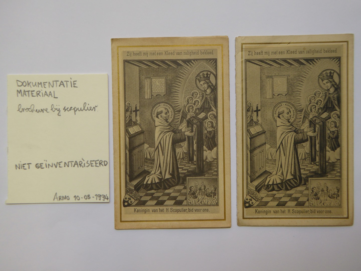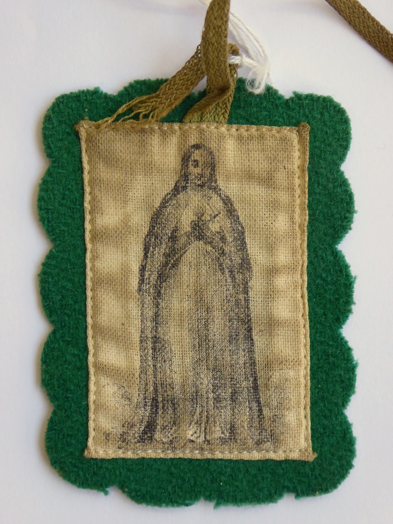 Scapulier, zg. groene scapulier van het Onbevlekt Hart van Maria, aan groen lint