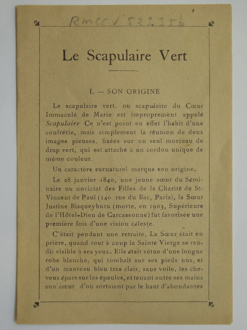 Brochure met uitleg over groene scapulier van het Onbevlekt Hart van Maria