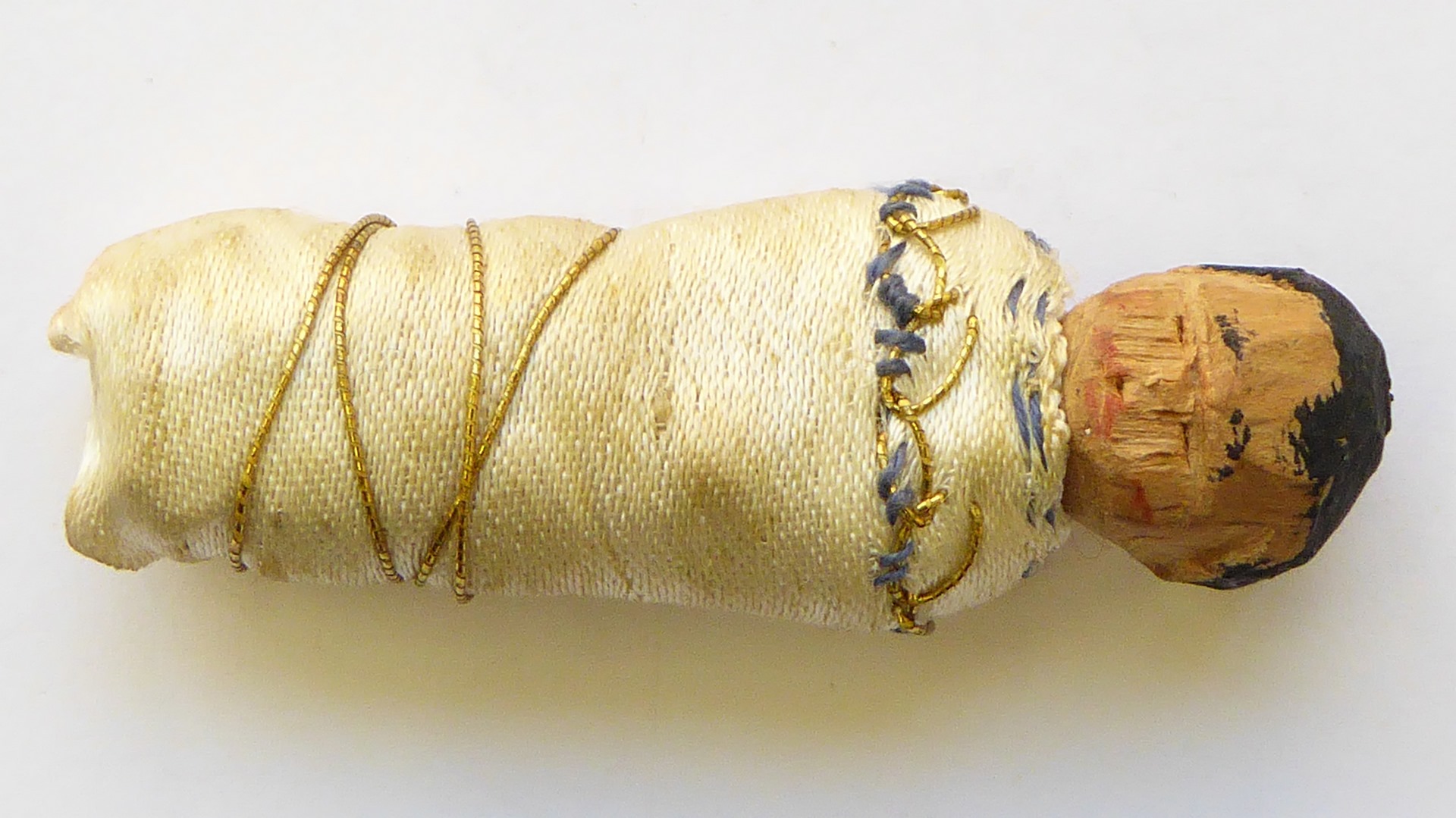 Kindje Jezus(?) ingebakerd en omwonden met gouddraadje