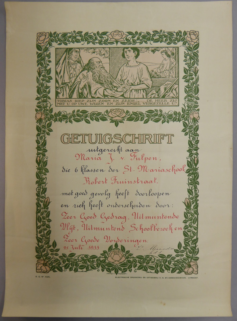 Getuigschrift uitgereikt aan Maria J. van Fulpen voor doorlopen St. Mariaschool, met voorstelling Tobias