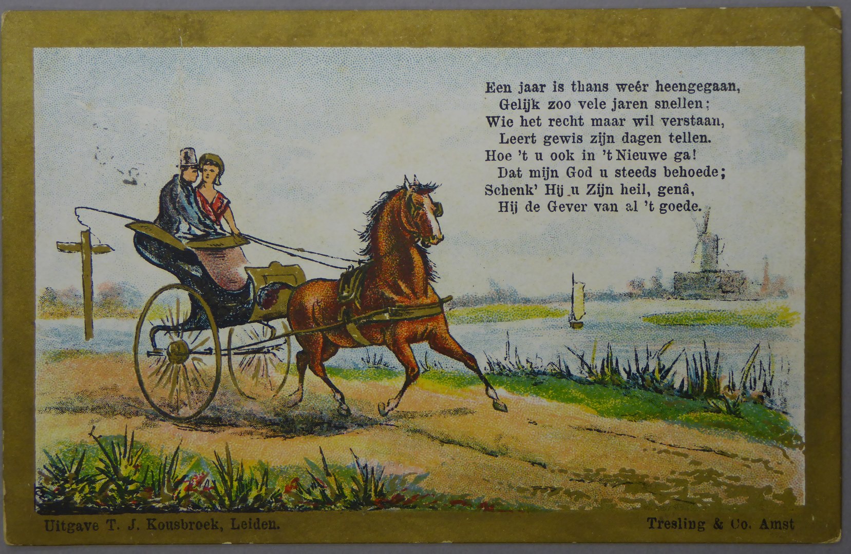 Prentbriefkaart, nieuwjaarskaart met rijtuig met paard, met "Een jaar is thans weer heengegaan, gelijk zoo vele jaren snellen; ..."