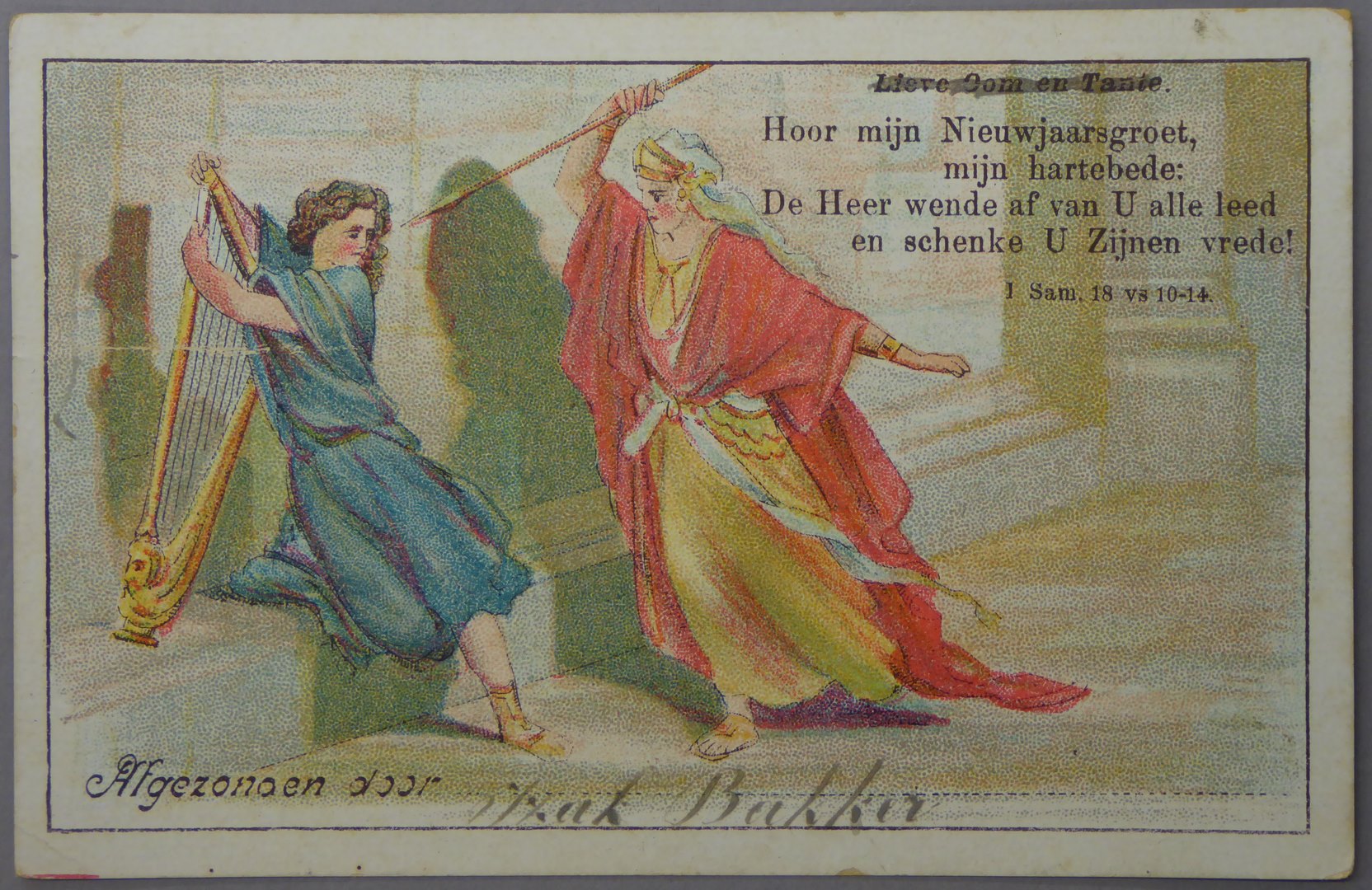 Prentbriefkaart, nieuwjaarskaart met Saul die speer naar David werpt, met "... Hoor mijn nieuwjaarsgroet, mijn hartebede: De Heer wende af van U alle leed en schenke U Zijnen vrede! ..."