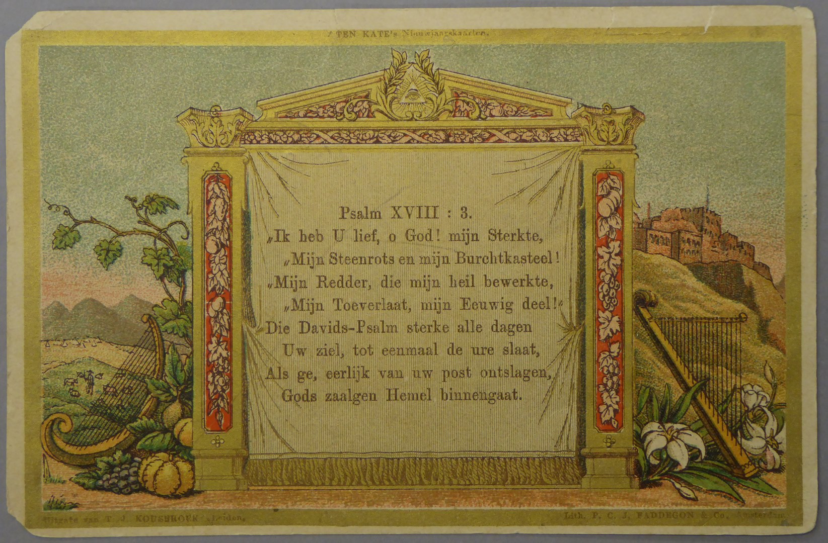 Prentbriefkaart, nieuwjaarskaart met "Psalm XVIII : 3. Ik heb u lief, o God! mijn Sterkte, ..."