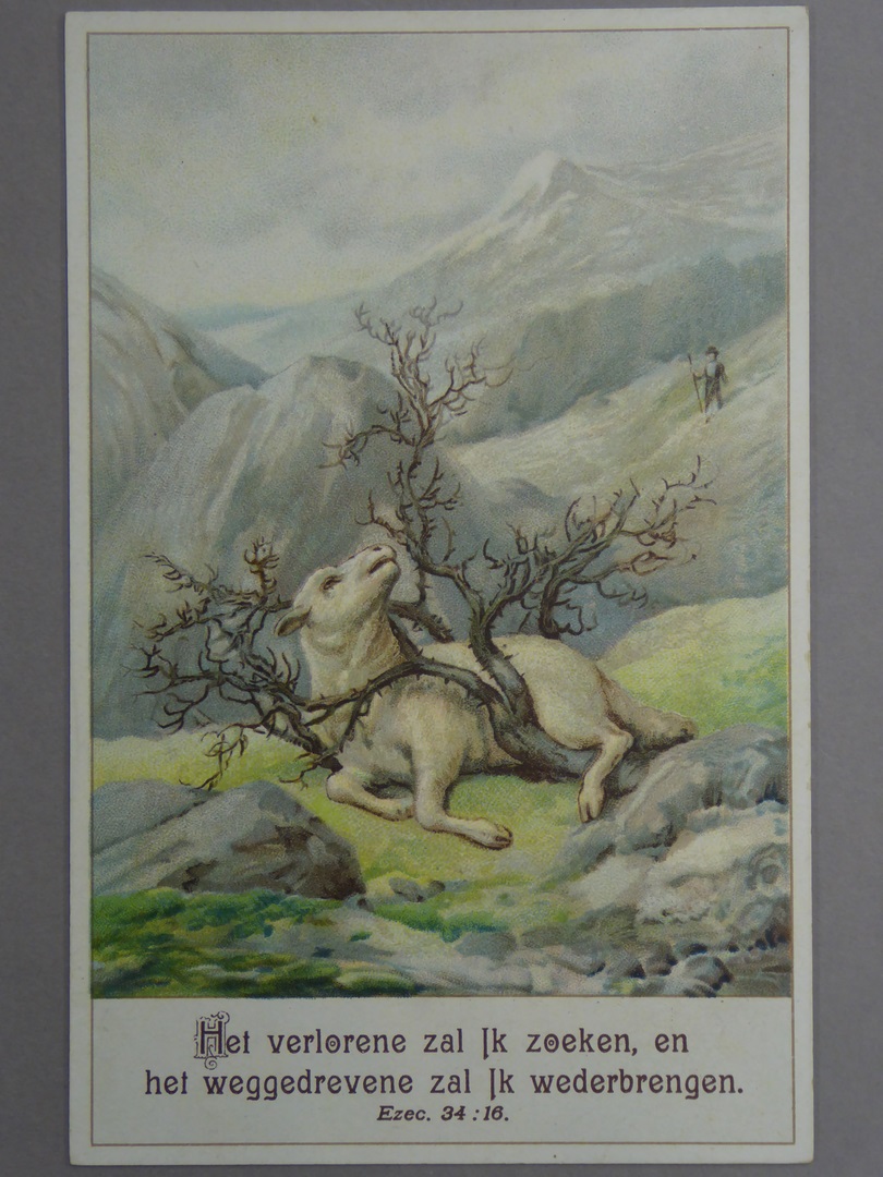 Prentbriefkaart, nieuwjaarskaart lam in doornenstruik, met "Het verlorene zal Ik zoeken, en het weggedrevene zal Ik wederbrengen Ezec. 34:16."