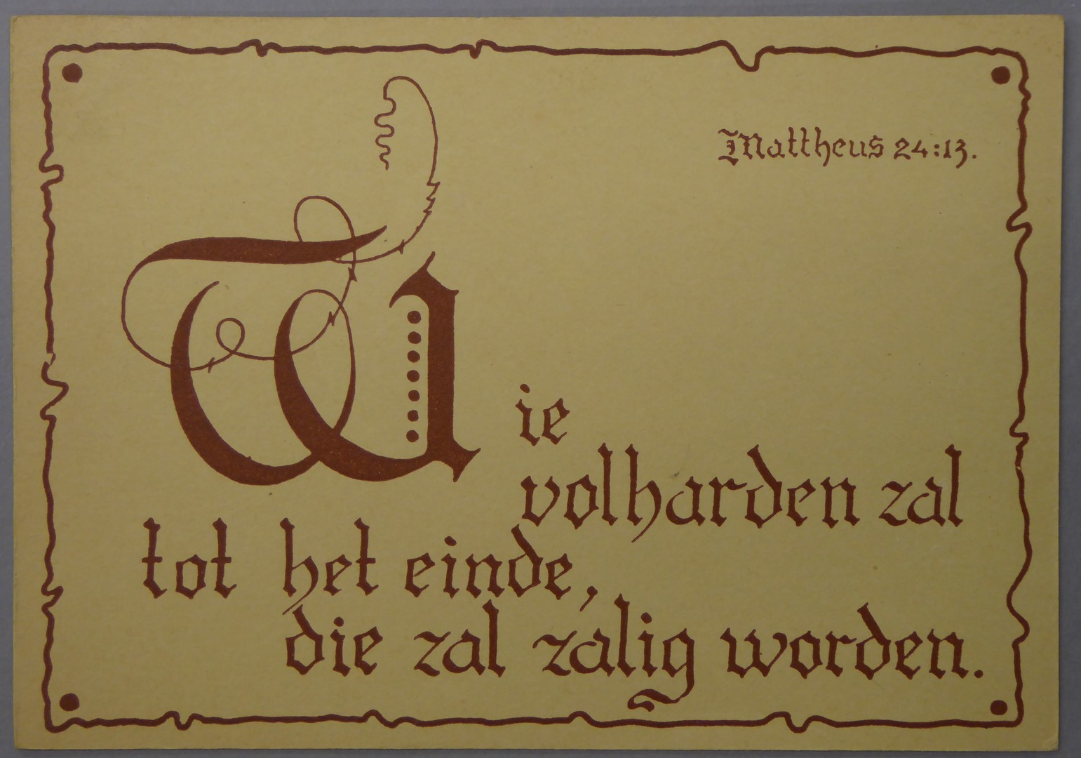Prentbriefkaart, nieuwjaarskaart met "Mattheus 24:13. Wie volharden zal tot het einde, die zal zalig worden."