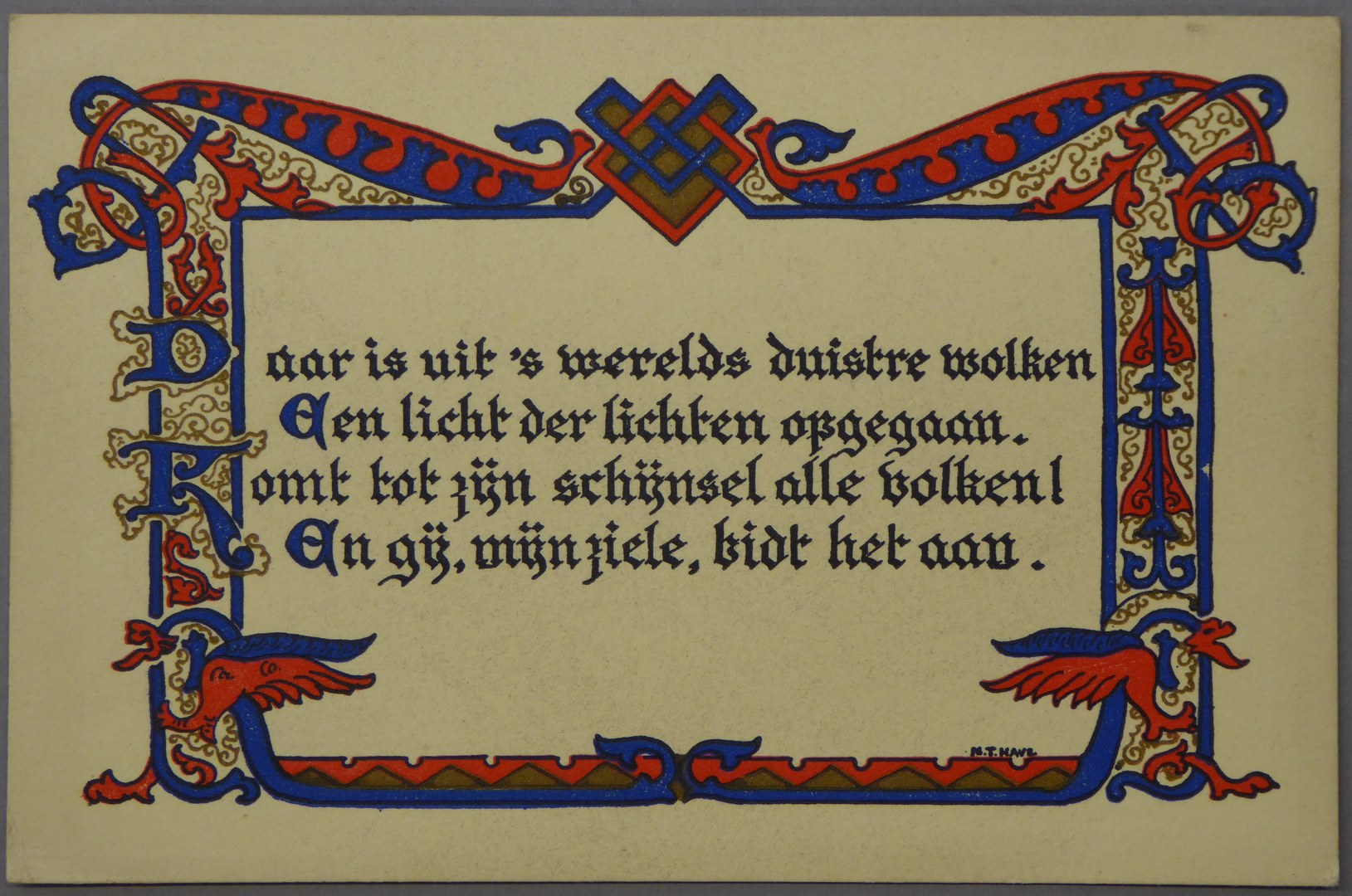 Prentbriefkaart, nieuwjaarskaart met in kalligrafie "Daar is uit 's wereld duistre wolken een licht der lichten opgegaan. ..."