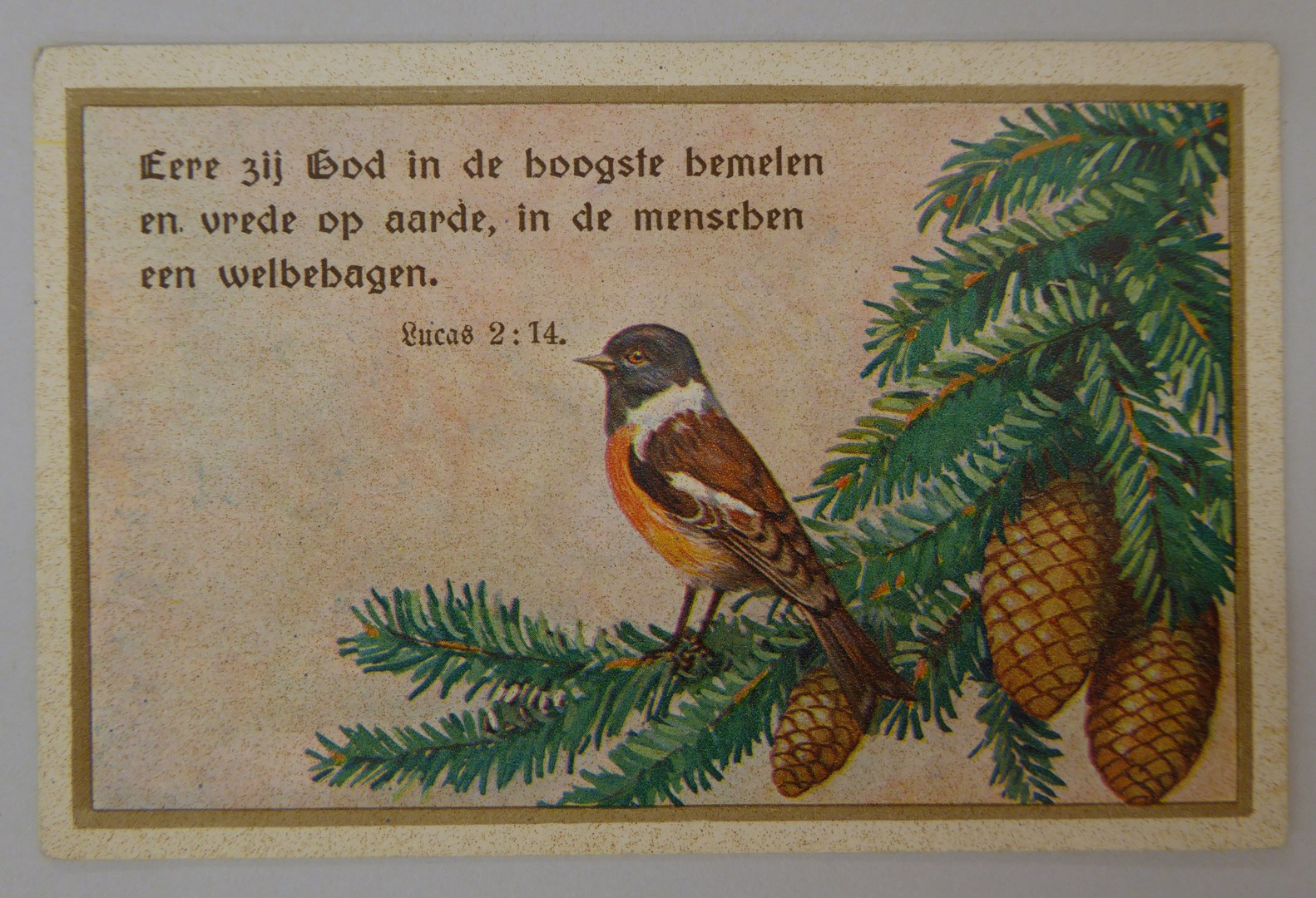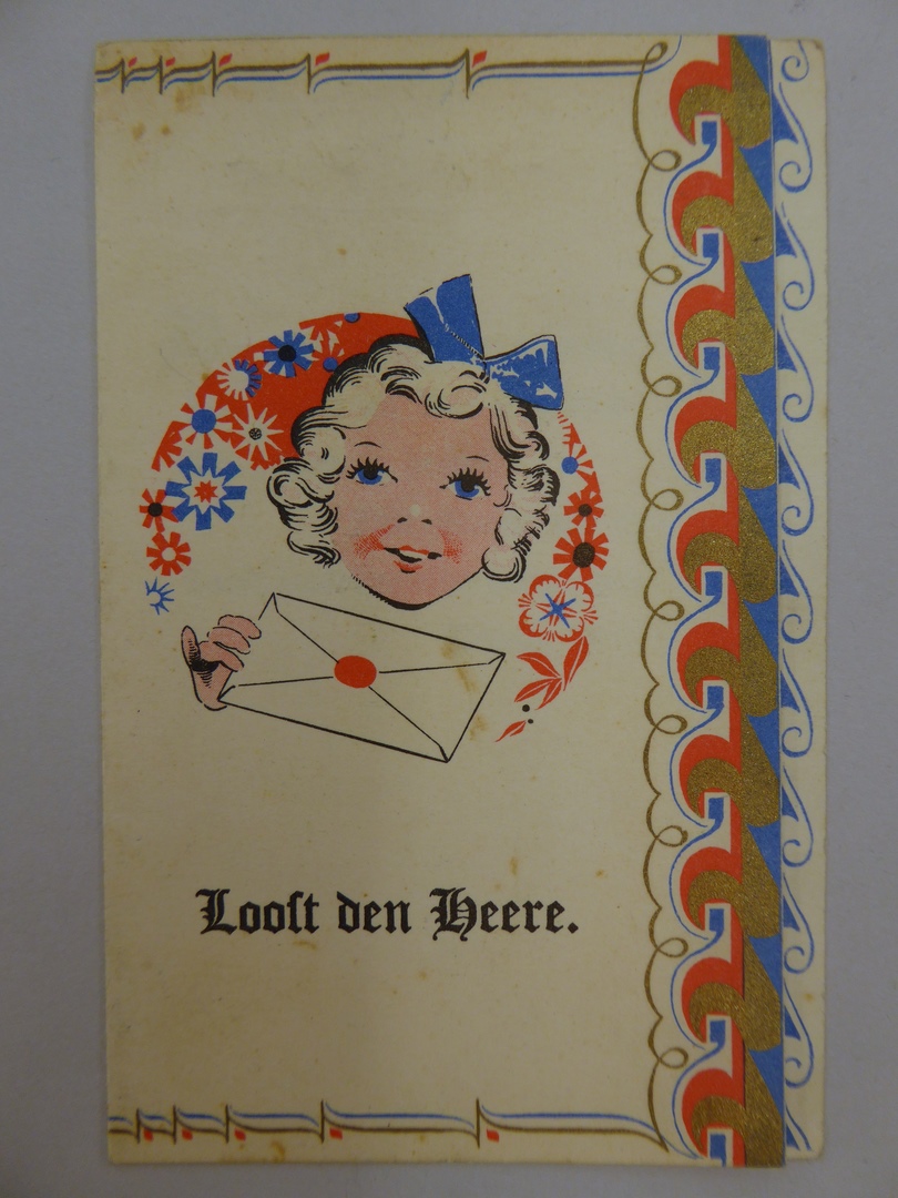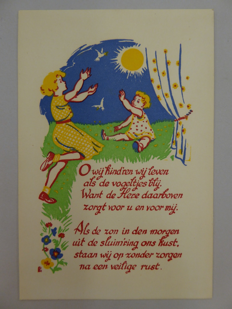 Prentbriefkaarten met vogels en spelende kinderen en spreuken