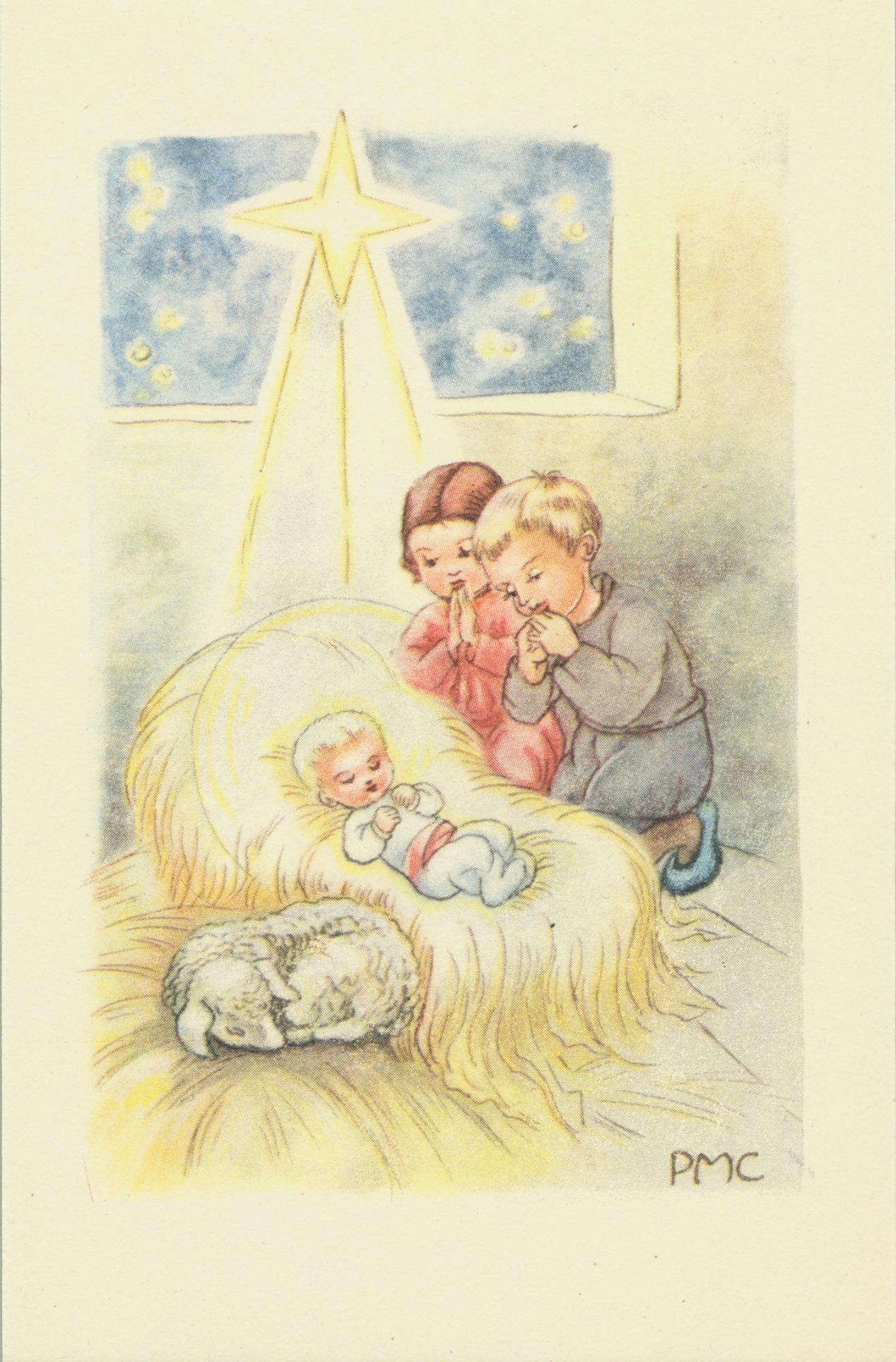 Kerstkaart met Christuskind in kribbe met twee knielende kinderen en lam