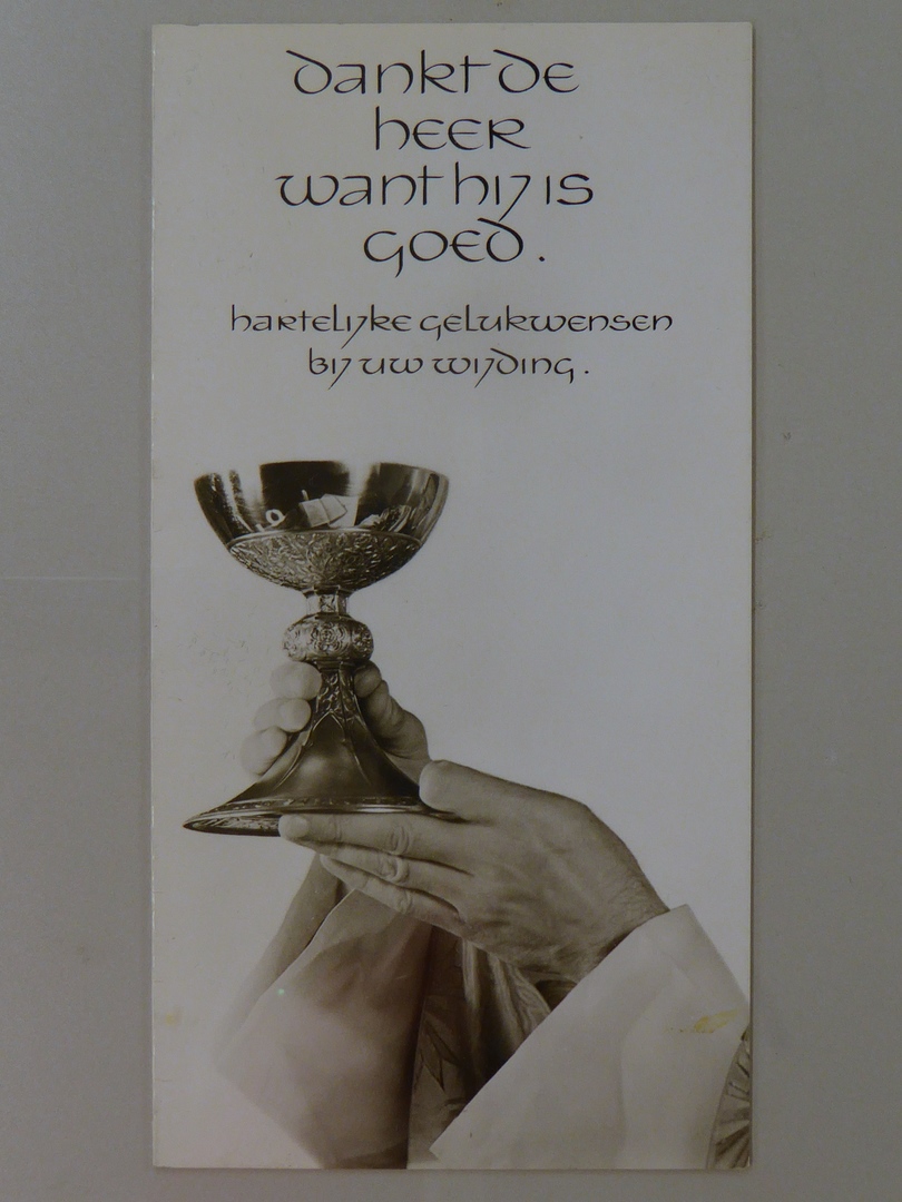 Felicitatiekaart bij priesterwijding, met twee handen die kelk dragen