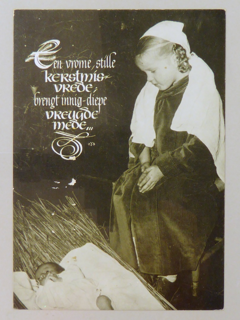Kerstkaart met meisje als Maria bij kribbe, met "Een vrome stille kerstmis vrede brengt innig diepe vreugde mede"