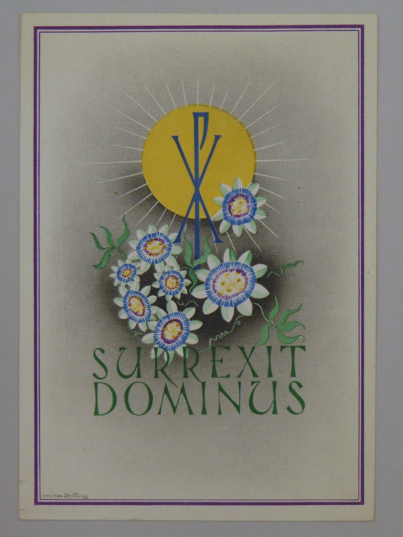 Kerst- of paaskaart met Christusmonogram, bloemen en met "Surrexit dominus"