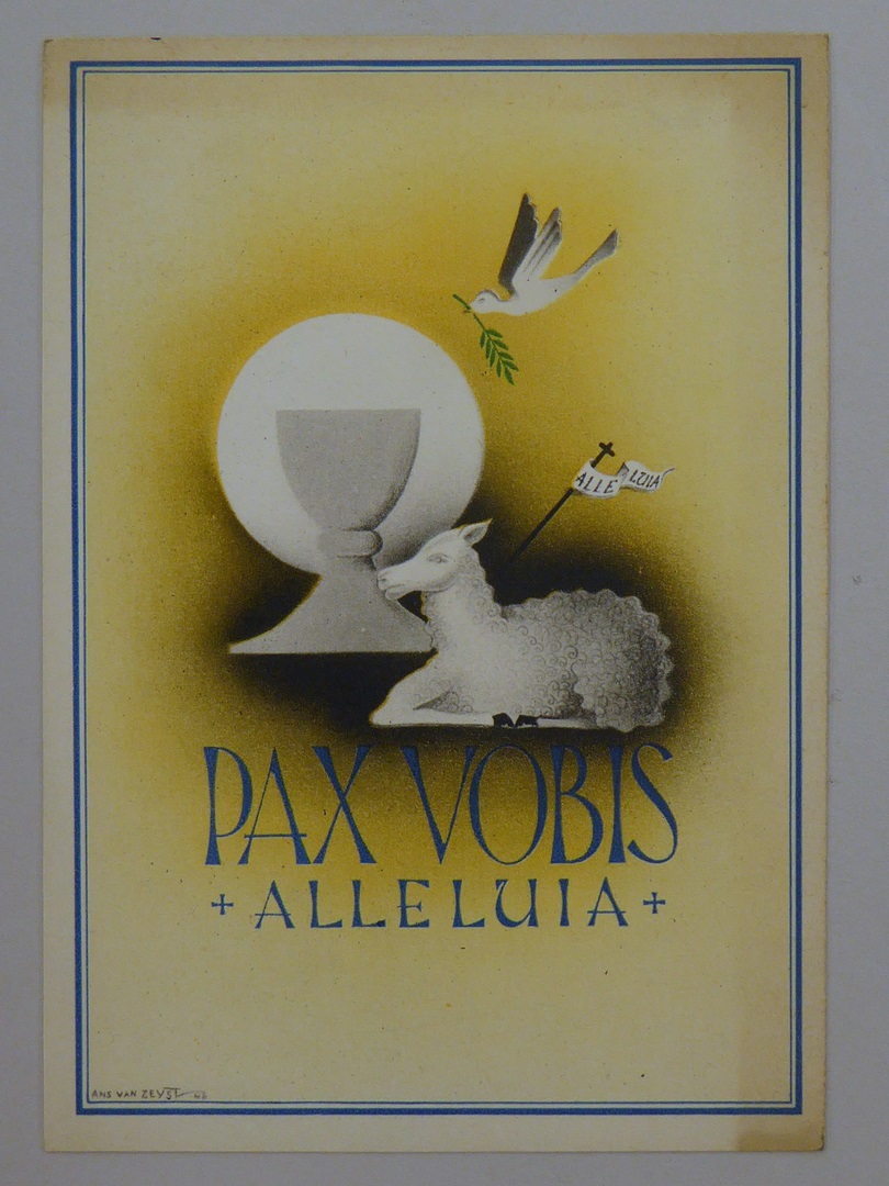 Paas- of kerstkaart met kelk, Lam Gods met kruisvaan, duif en met "Pax vobis alleluia"