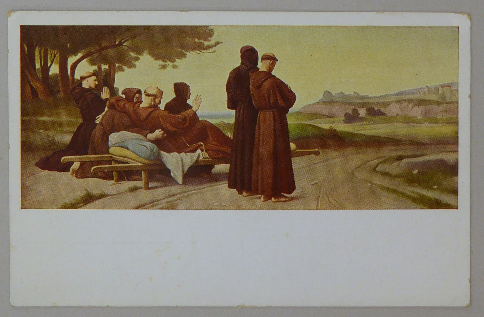 Prentbriefkaart met stervende H. Franciscus t.g.v. franciskanen jubeljaar 1226-1926