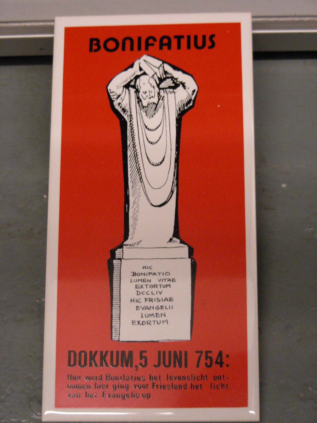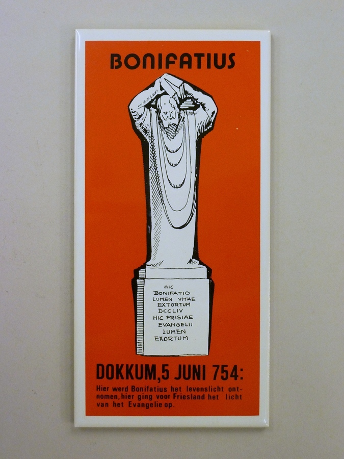 Wandtegel met Bonifatius, met "Dokkum, 5 juni 754: Hier ... het levenslicht ontnomen, hier ..."