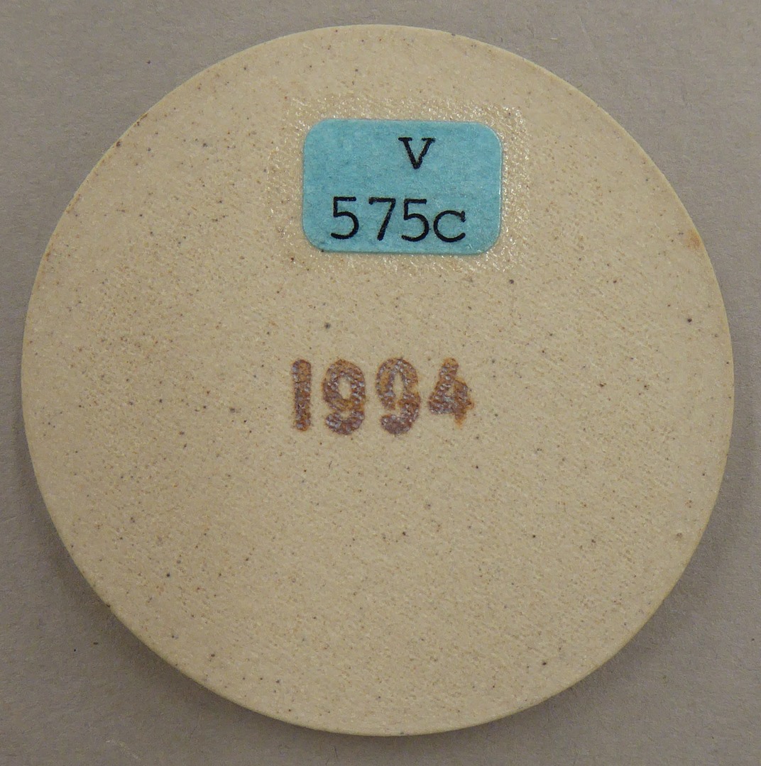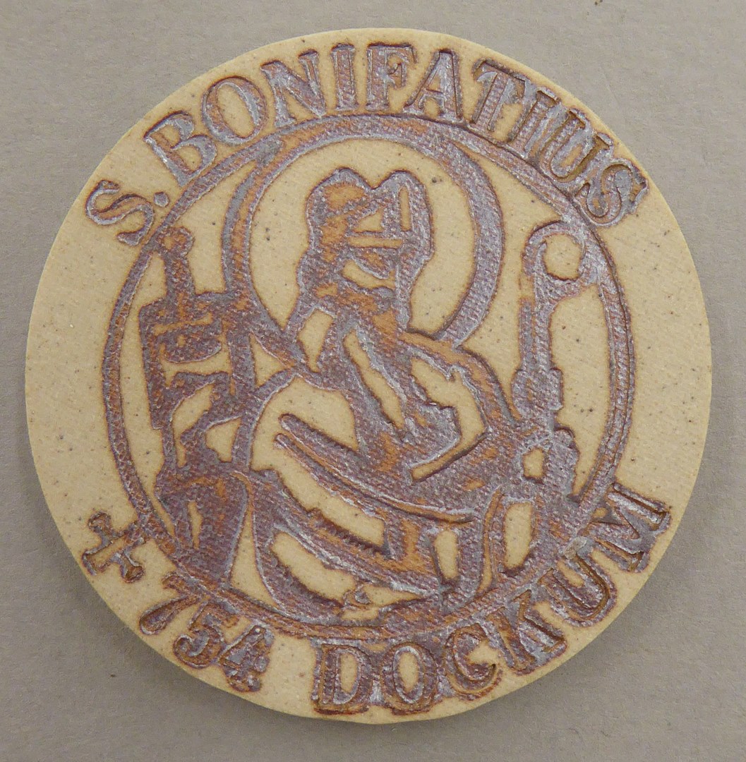Pelgrimsinsigne met "S. Bonifatius + 754 Dockum", met afbeelding Bonifatius, achterop met "1994"
