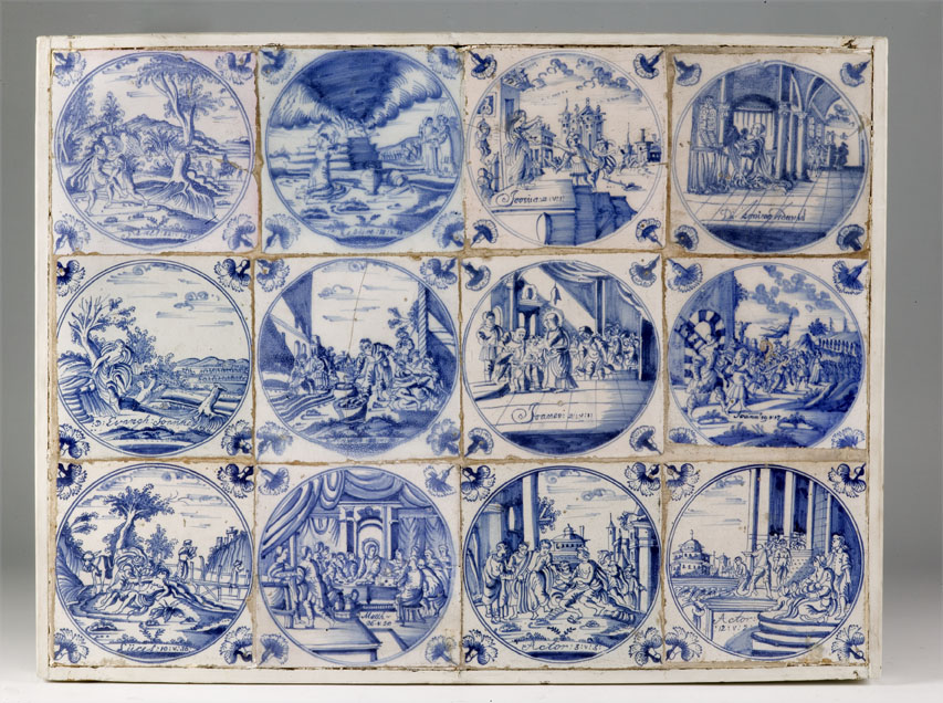 Tegeltableau met twaalf tegels met in blauw bijbelse voorstellingen in medaillons