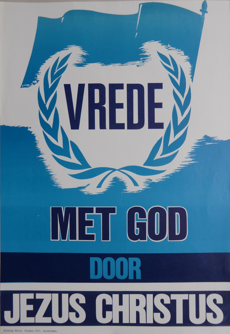 Blauw affiche met "Vrede met God door Jezus Christus"