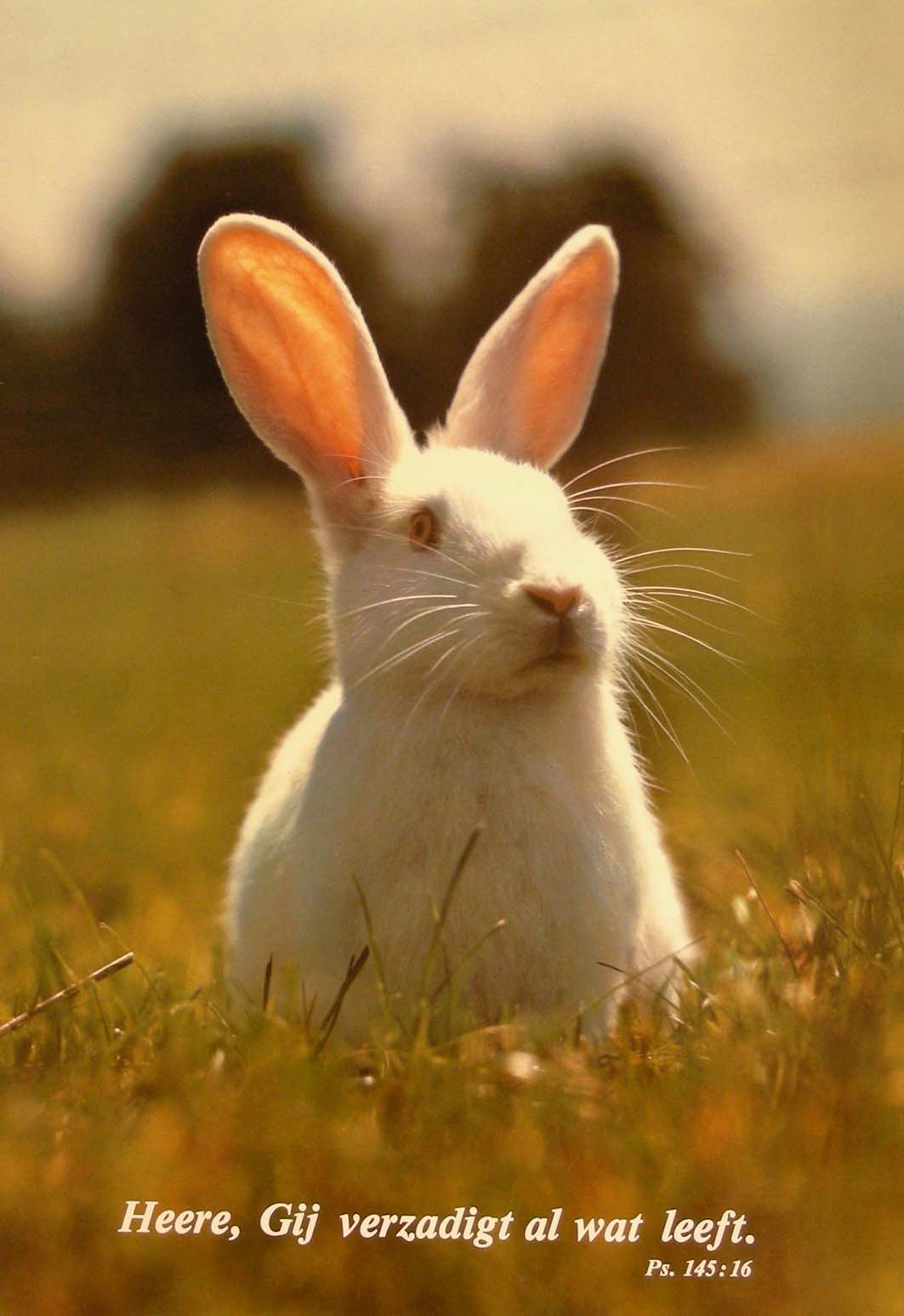Affiche met "Heer, Gij verzadigt al wat leeft ps.145:16" met wit konijn in weiland