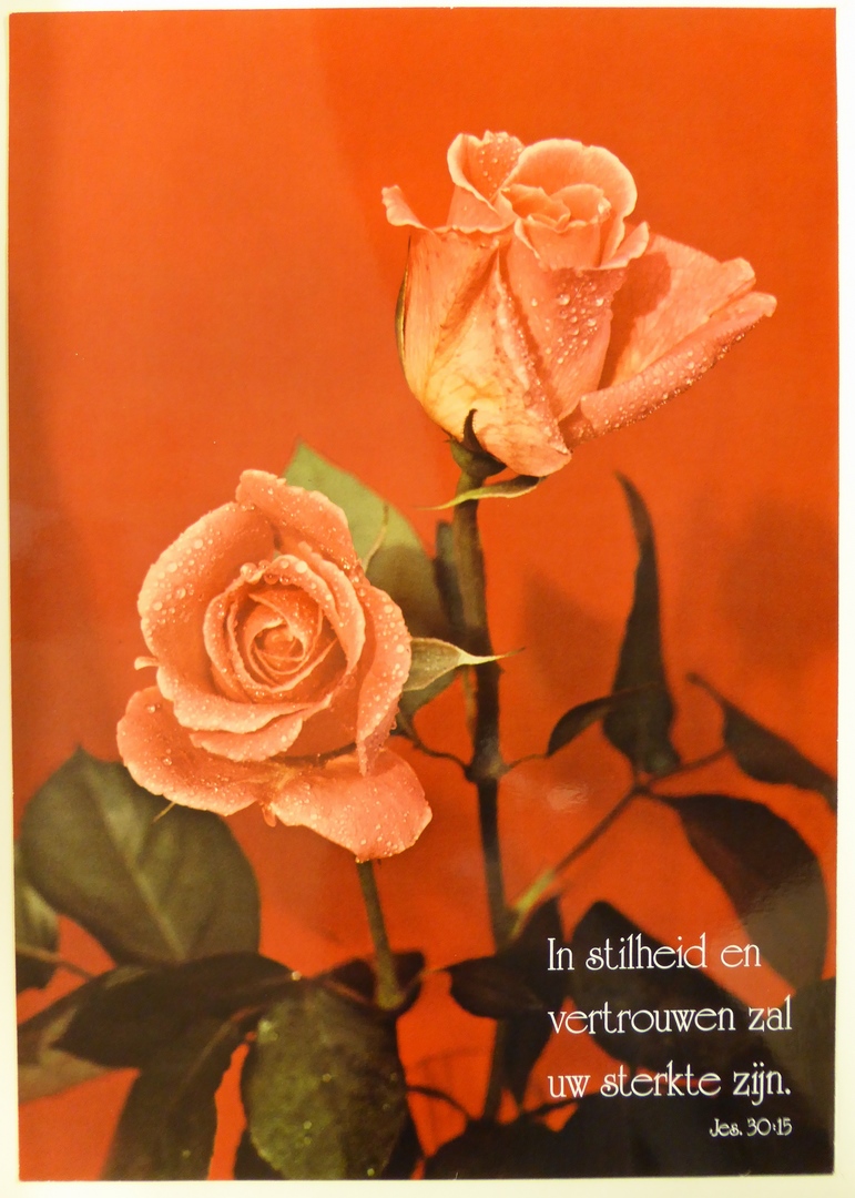 Affiche met "In stilheid en vertrouwen zal uw sterkte zijn Jes.30:15" met rode rozen