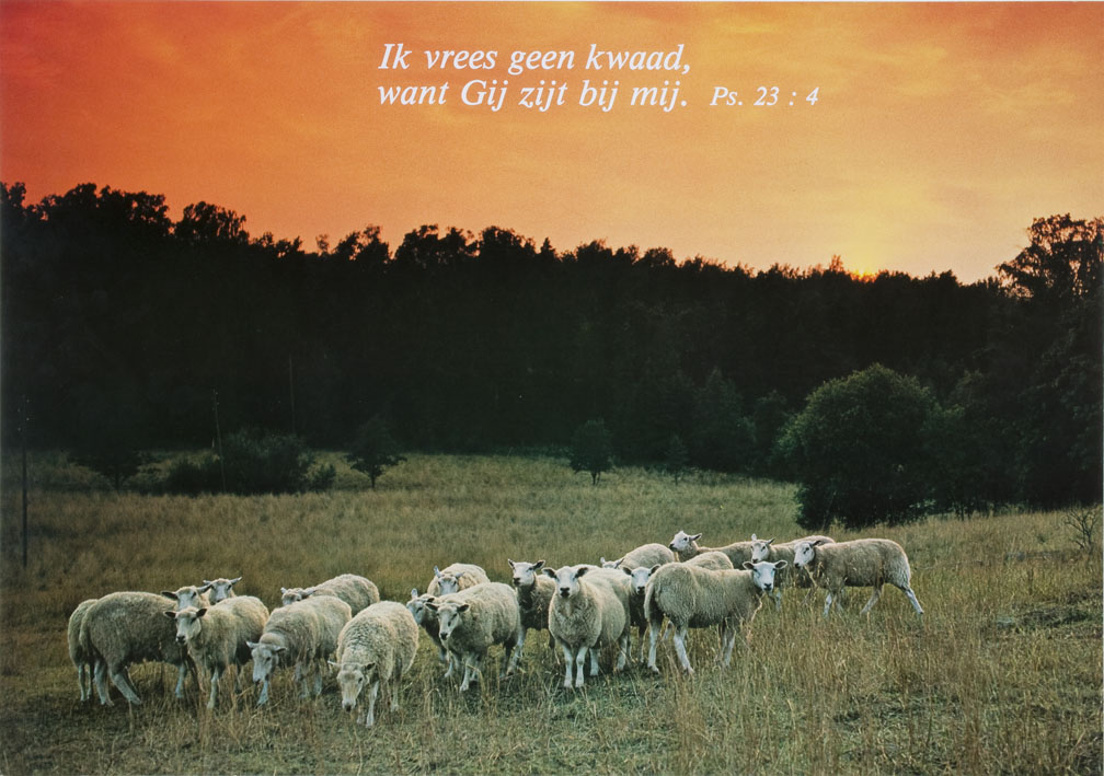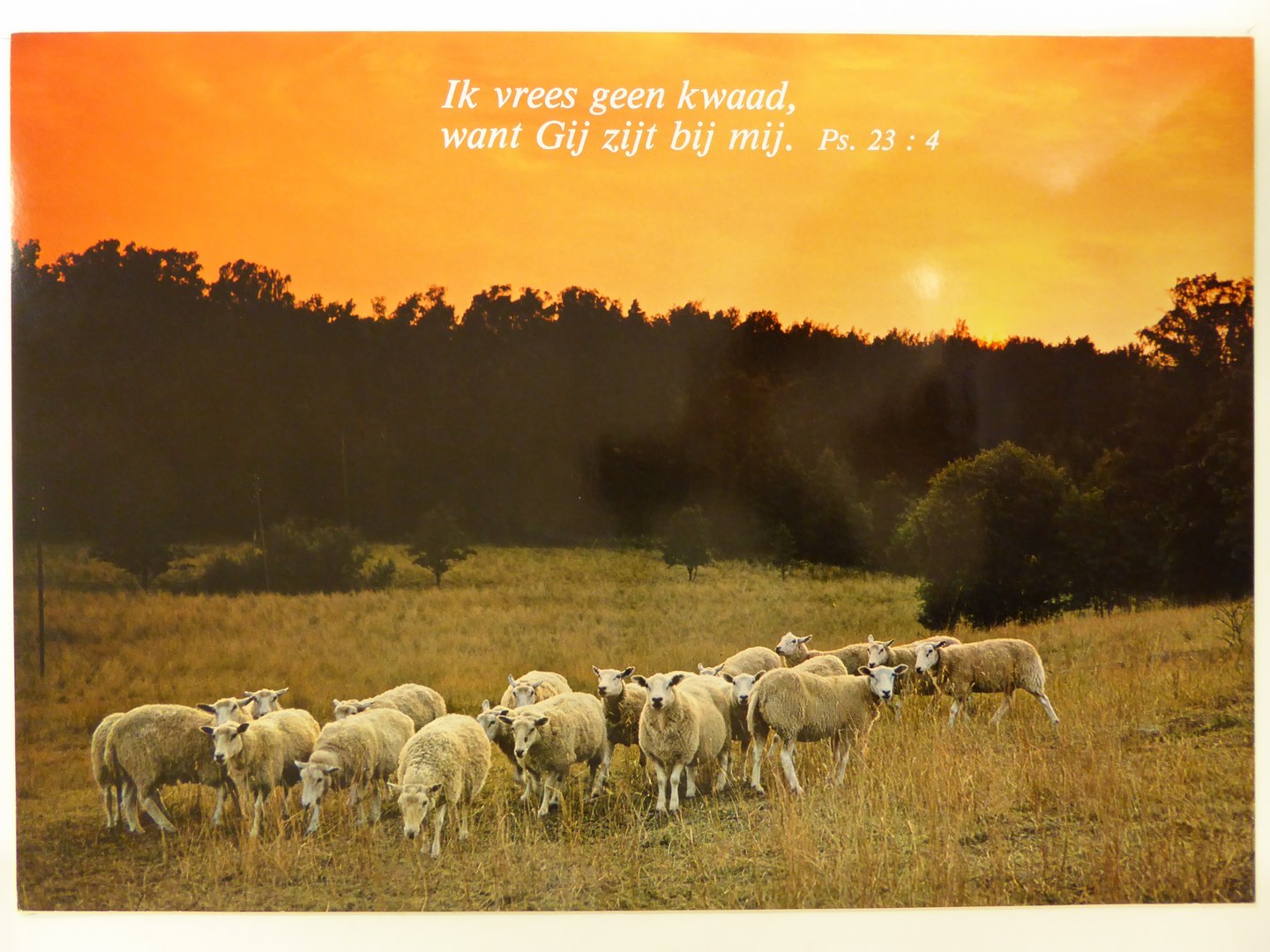Affiche met "Ik vrees geen kwaad, want gij zijt bij mij, Ps.23:4" met schapen in weiland