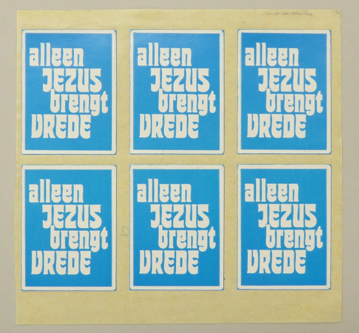 Vel met zes blauw-witte stickers met "Alleen Jezus brengt vrede"