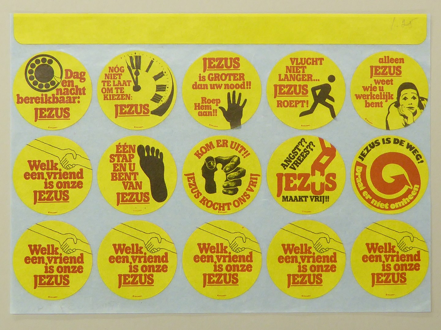 Vel met vijftien geel-rood-zwarte stickers o.a. met "Dag en nacht bereikbaar: Jezus"