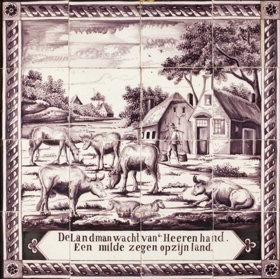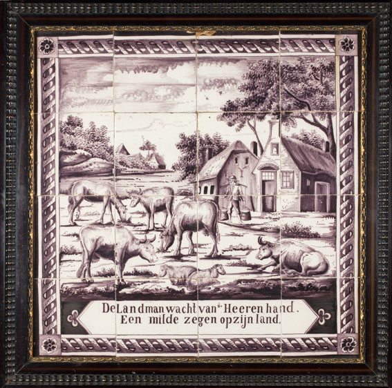 Tegeltableau van zestien tegels met koeien en schapen voor hoeve en met "De landman wacht van s-Heeren hand. Een milde zegen op zijn land."
