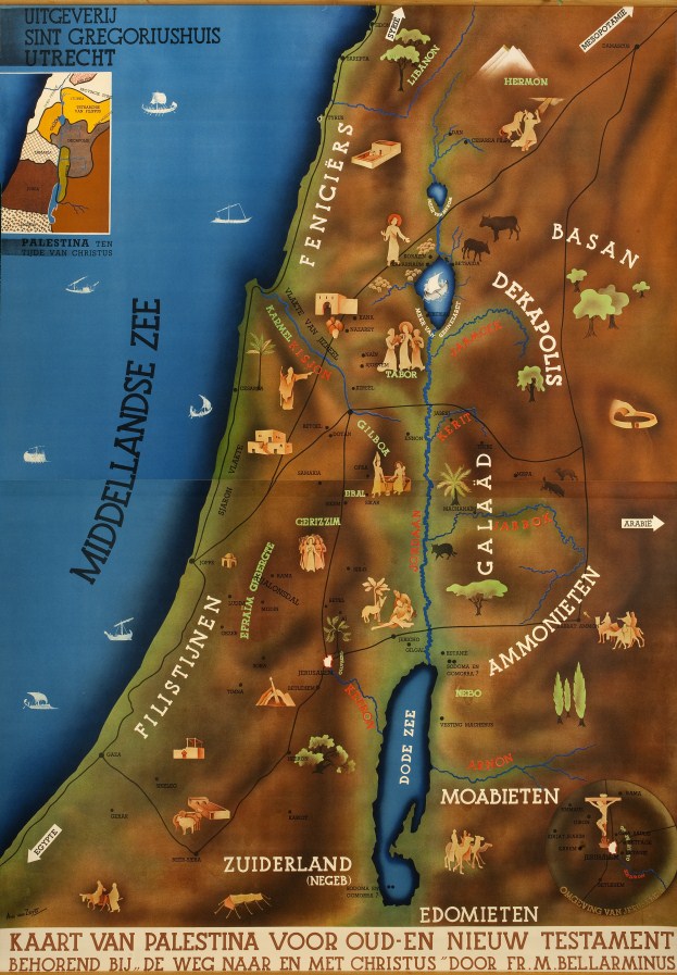 Schoolplaat "Kaart van Palestina voor Oud- en Nieuw Testament, behorend bij de weg naar ..."