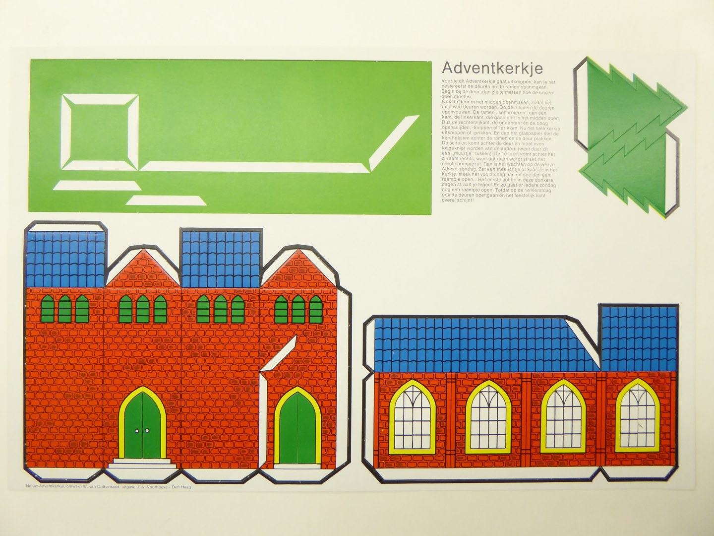 Zondagsschoolmateriaal: adventskerkje met te openen raampjes, verso met opgeplakte gele transparante tekststrook