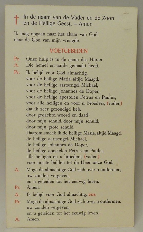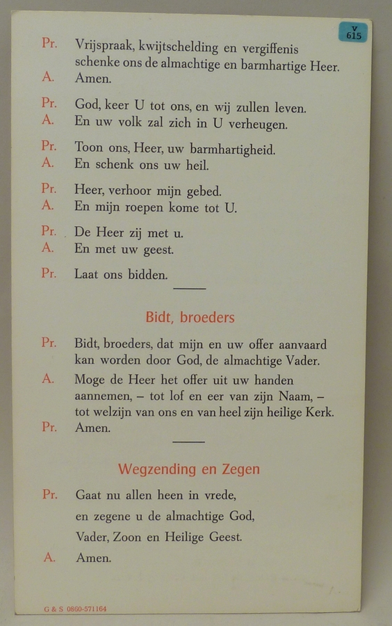 Tekstbord met "Voetgebeden ... Bidt, broeders ... Wegzending en Zegen"