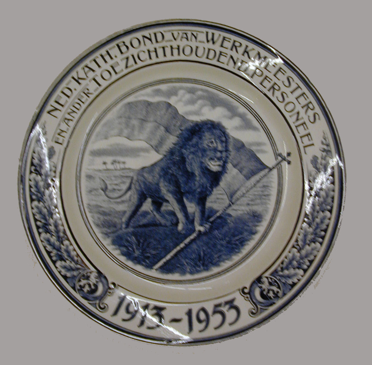 Wandbord met "Ned.Kath.Bond van werkmeesters ... toezichthoudend personeel" en leeuw met kruisvaan