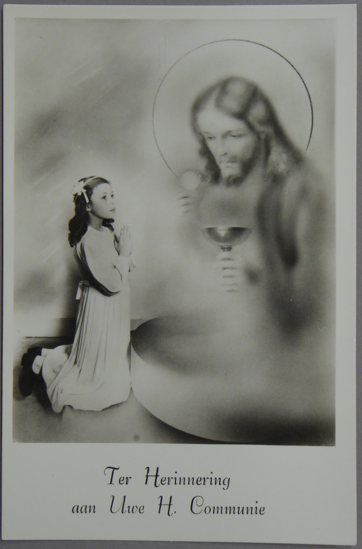 Prentbriefkaart, knielend meisje voor Christusbuste met "Ter herinnering ... H. Communie"