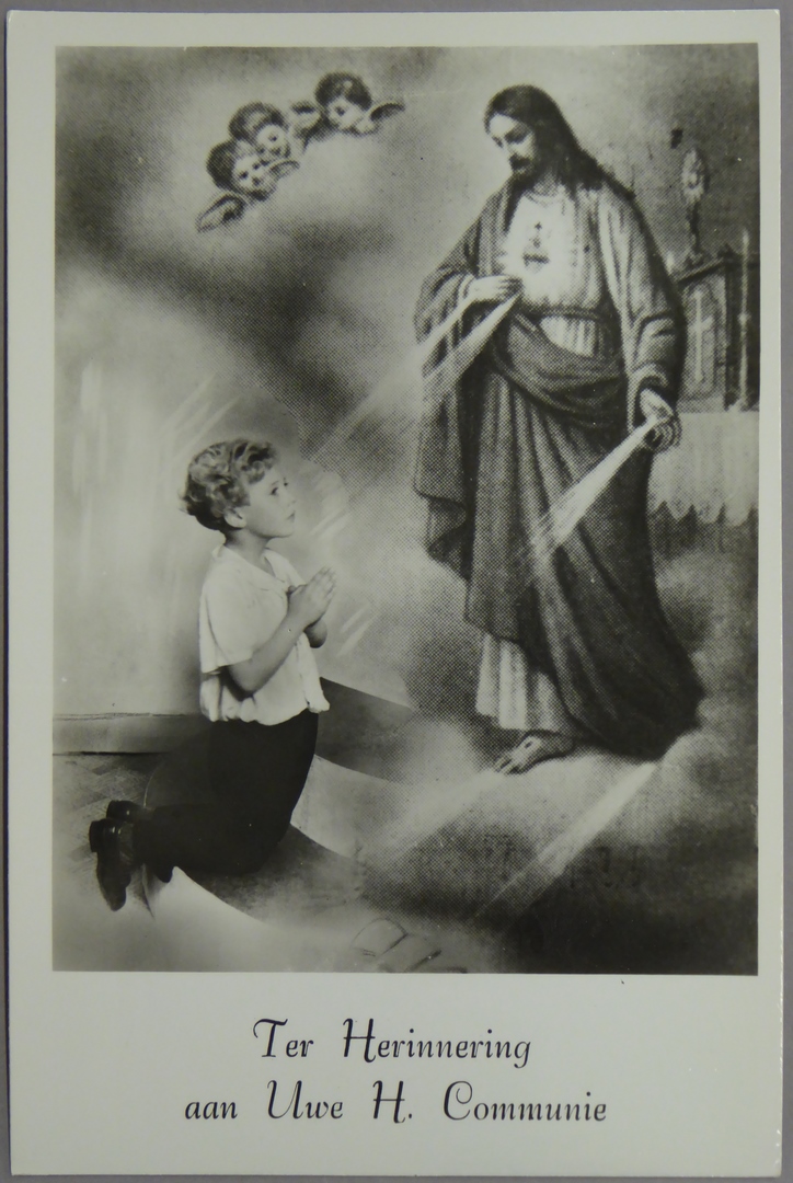 Prentbriefkaart, knielende jongen voor Christus bij altaar met "Ter herinnering ... H. Communie"