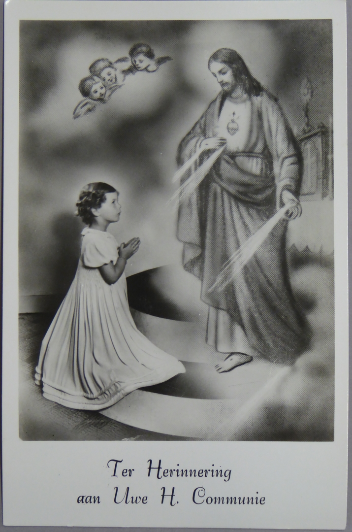 Prentbriefkaart, knielend meisje voor Christus bij altaar met "Ter herinnering ... H. Communie"