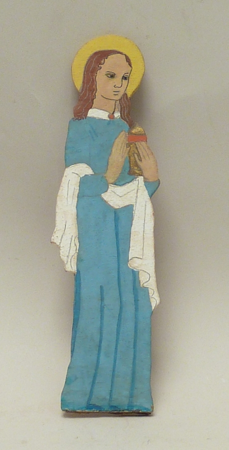 Gefiguurzaagde Maria van Jacobus in blauw gewaad met zalfbus