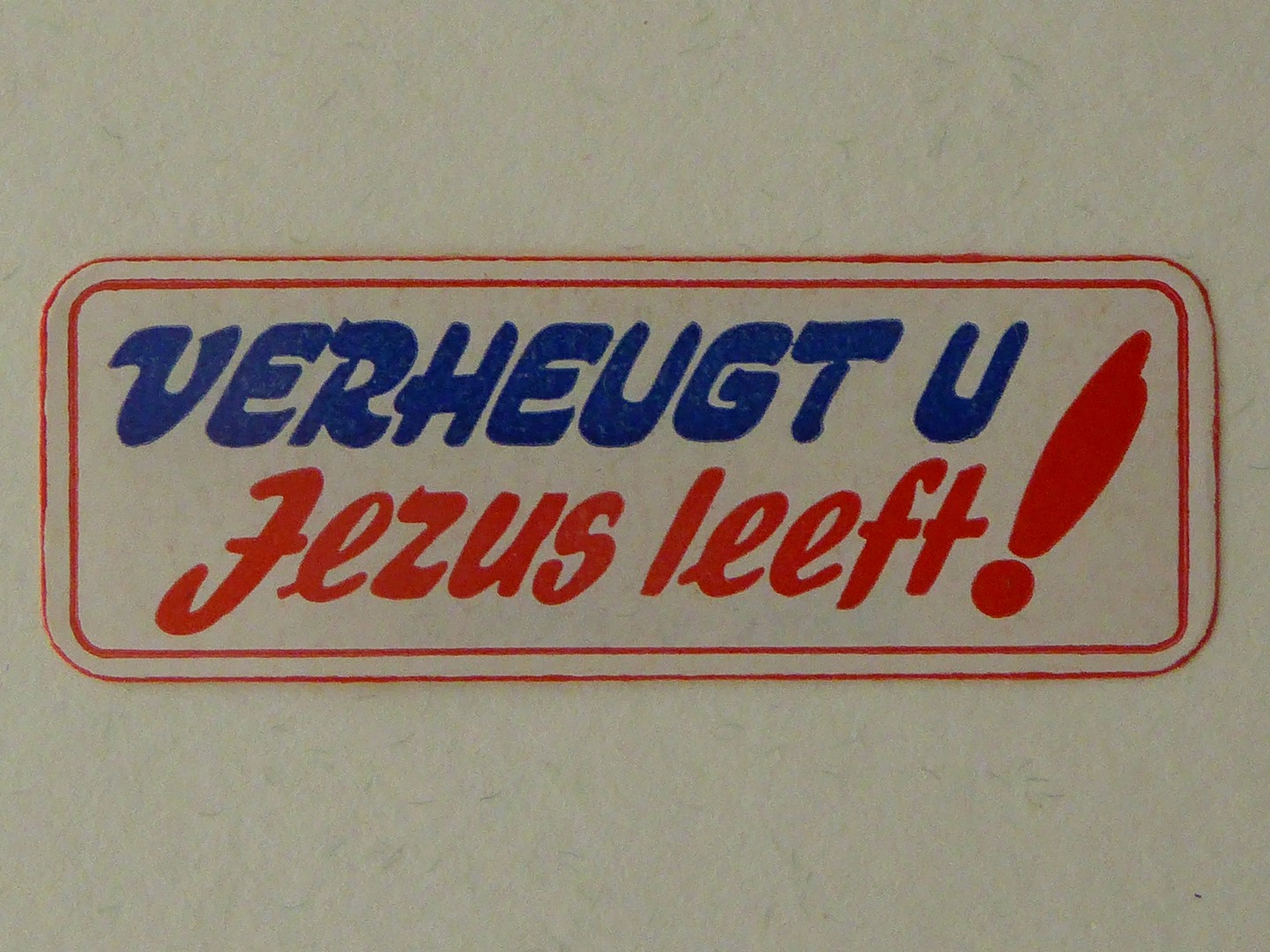 Rood-wit-blauwe sticker met "Verheugt u Jezus leeft!"
