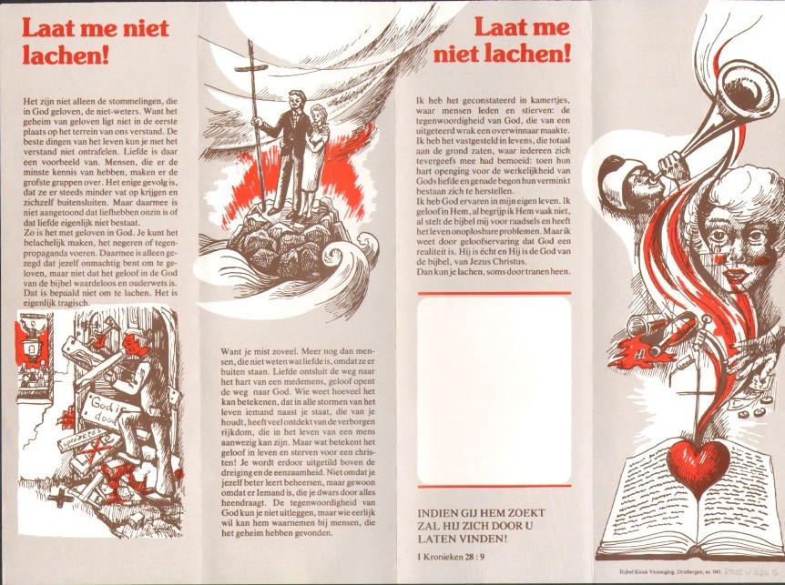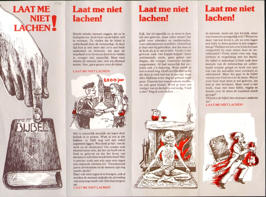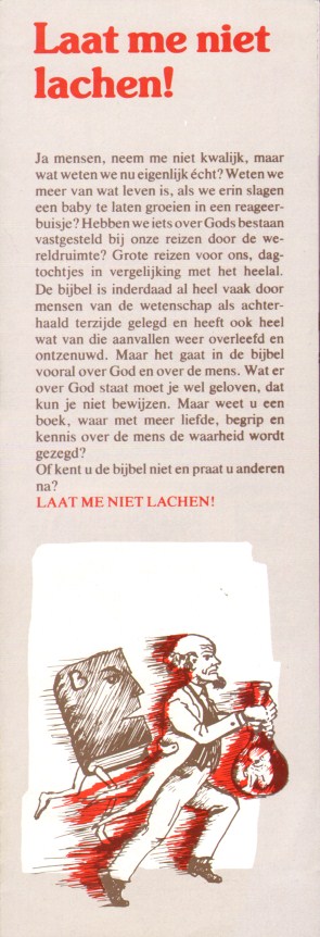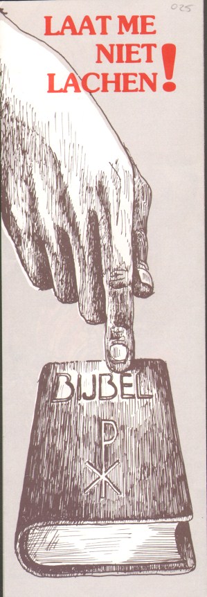 Folder met hand wijzend naar bijbel, met "Laat me niet lachen"