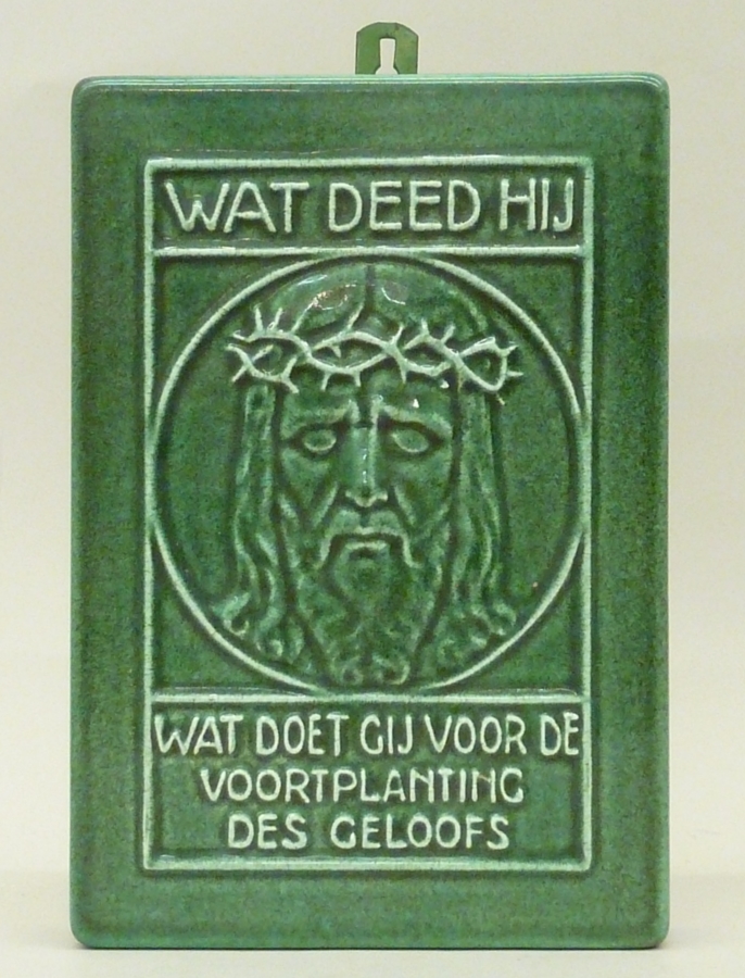 Groene spaarpot, 'pausbusje' met een reliëf gelaat Christus met doornenkroon