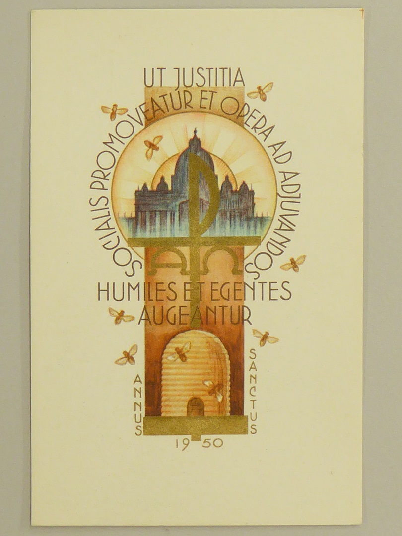 Prentbriefkaart uitgegeven t.g.v. het Heilig Jaar 1950 met "Ut justitia socialis promoveatur ..."