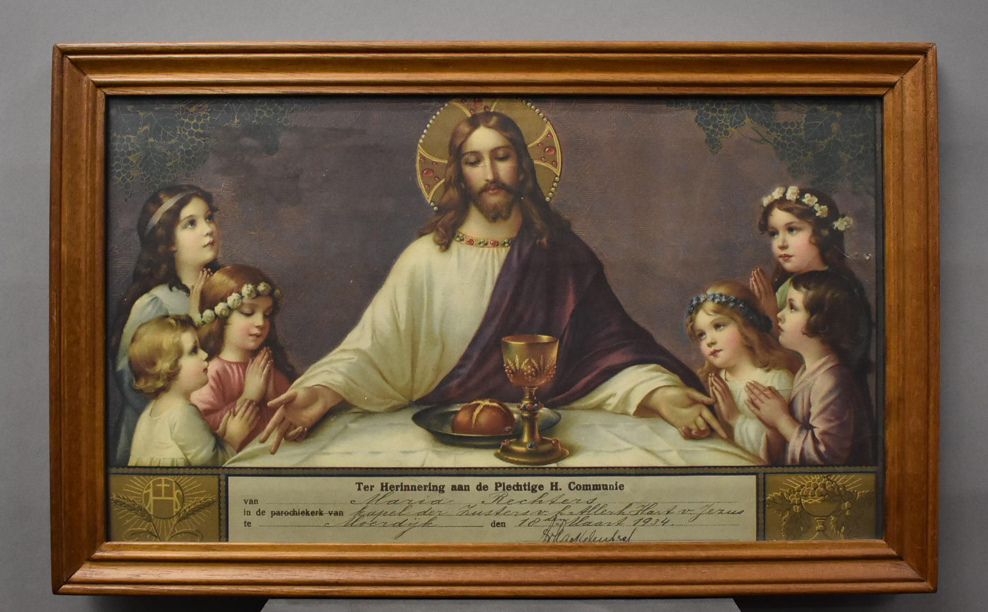Plechtige communieprent Maria Rechters te Moerdijk, met Christus aan tafel en zes bruidjes