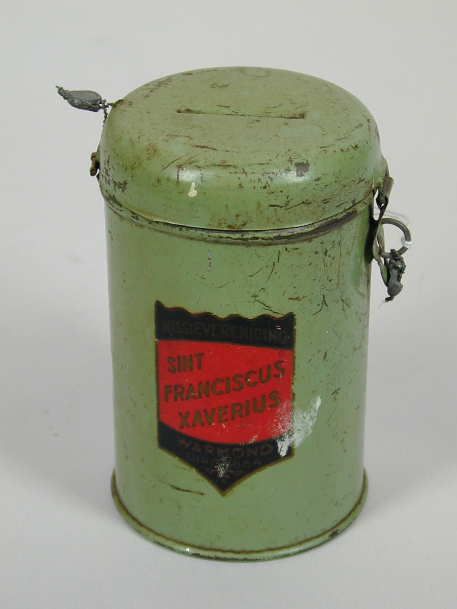 Missiebusje voor Missievereniging Sint Franciscus Xaverius Warmond, groen met zwart-rood logo