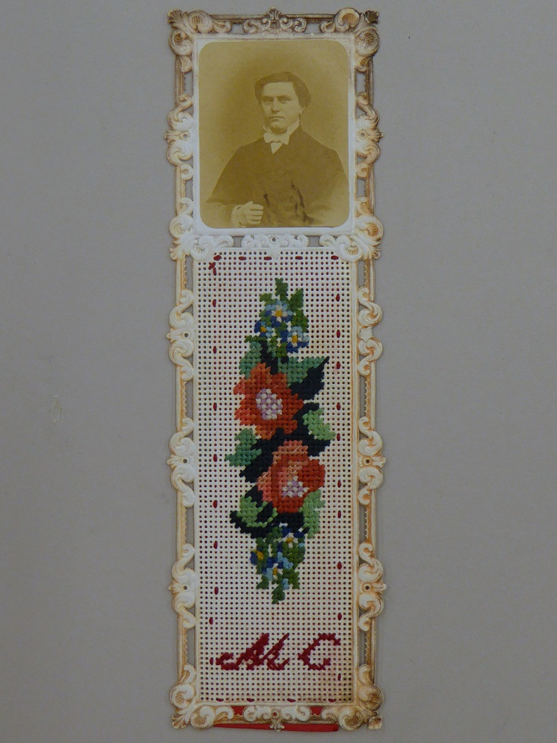Bladwijzer met fotoportret van predikant Frederik Karel Antonius Pantekoek, geborduurd met "MC" en florale motieven