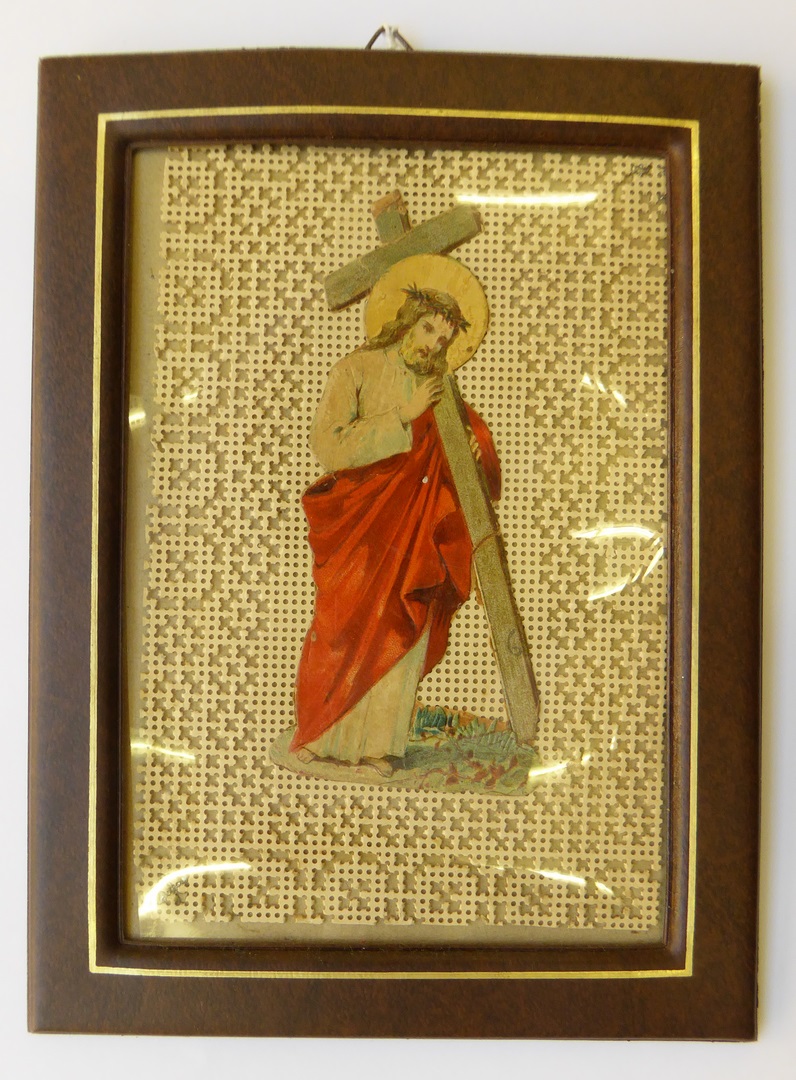 Kruisdragende Christus omlijst met stramienkarton waarin motieven zijn uitgeprikt, in plastic lijst
